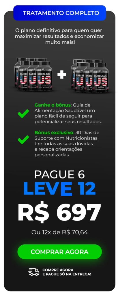 Com o Tratamento Completo (6 meses), você economiza 70% e garante um ano completo de BariBlack US, isso significa 30 kg a menos na balança e resultados mais duradouros e garantidos!